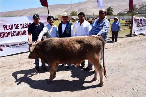 ![]() Villa Locumba.- En ceremonia pública, 23 ganaderos del distrito Locumba se beneficiaron con la entrega de 345 "toros de engorde", producto del fondo de desarrollo Jorge Basadre en Locumba, por parte de la empresa Southern Perú en coordinación con la Municipalidad Provincial Jorge Basadre. Durante la ceremonia se realizó una entrega simbólica a 5 ganaderos, quienes recibieron estos especímenes de manos del alcalde Manuel Oviedo Palacios y el jefe de desarrollo comunitario de SPCC, Carlos Quiñonez, acompañados de distintas autoridades de la provincia. Las palabras de agradecimiento estuvieron a cargo de Valentín Apomaita, en representación de los 23 ganaderos beneficiados. "Hoy es el sueño que todos queríamos hacer realidad, agradecemos a todos los actores y autoridades que nos acompañarnos a hacer que la gestión sea realidad, agradezco a la empresa Souther, al señor alcalde que deja un recuerdo con los toros y siempre nos vamos a acordar." Los toros actualmente pesan aproximadamente 150 kilos de carcasa y entre 280 a 300 kilos de peso vivo. Ahora los ganaderos deberán engordar a estos animales, buscando duplicar su peso en los próximos 2 meses, para luego venderlos en los distintos mercados y con el dinero obtenido comprar nuevos toros y repetir el proceso. "Sinceramente contento de que después de muchísimo tiempo, se hace entrega del primer lote. Ojalá que cada uno de los ganaderos que va recibir, sepan dirigir la crianza de estos animales para un bien común y ese bien común, sea en beneficio de cada uno de los 146 ganaderos y agricultores (de los 4 paquetes que atiende el plan de desarrollo agropecuario en Locumba) que están siendo beneficiados." Refirió el alcalde Manuel Oviedo. |