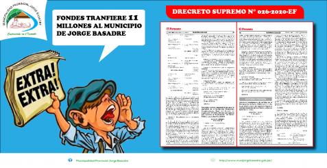 Villa de Locumba.- El Fondo para el Desarrollo (FONDES) del Instituto de Defensa Civil (IDECI) transfirió 11, 821, 446.79 soles al municipio de Jorge Basadre para el financiamiento de 24 Inversiones de Rehabilitación por Lluvias. El desembolso fue autorizado mediante el Decreto Supremo N° 026-2020-EF del Ministerio de Economía y Finanzas publicado en el boletín de normas legales del diario oficial El Peruano del 08 de febrero del 2020. El camino para obtener la transferencia de este dinero fue largo y difícil, pero se logró gracias a la tenacidad y largas gestiones realizadas por el alcalde de la provincia de Jorge Basadre, Félix Morales Mamani y su equipo de funcionarios municipales. Primero la solicitud de financiamiento tuvo que pasar una rigurosa evolución técnica, para posteriormente ser evaluada por la Comisión Multisectorial del Fondo para Intervenciones ante la Ocurrencia de Desastres Naturales, quienes dieron opinión favorable para la priorización de la propuesta de la comuna basadrina. Los fondos serán principalmente utilizados para la rehabilitación de infraestructura que fue dañada por el huaico del pasado 8 de febrero en el distrito de Locumba.