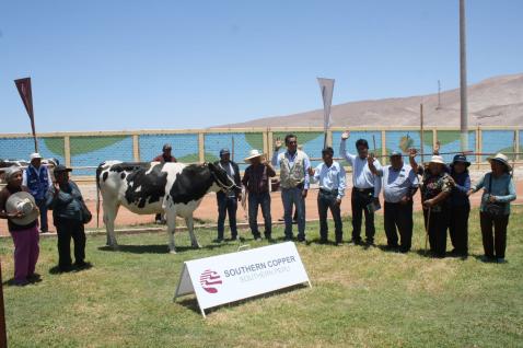 Villa de Locumba.- El municipio de Jorge Basadre en Coordinación con la empresa Southern Perú realizaron la entrega de 76 vaquillonas a ganaderos de Locumba con el Fondo de Desarrollo de Jorge Basadre. El acto de donación se llevó acabo en el estadio municipal Jorge Pinto Liendo, y contó con la presencia del regidor de provincial de Jorge Basadre, Juan Vizcarra Mamani, el representante de Casa Nuestra de Southern Perú, Ing. Renán Carnero Luque, el gerente de Desarrollo Económico, Med. Vet. Luis Alberto Mamani Centeno, beneficiarios y población local. Son 42 los adjudicatarios que recibieron el ganado vacuno que fue comprado al establo Los Rosales de Agrícola Pampa Baja de la ciudad de Arequipa, y que cuentan con registro como puro de pedigrí en la Asociación Holstein del Perú. De esta manera se busca incentivar la actividad pecuaria en el distrito de Locumba, así como, mejorar la calidad genética de los animales de los hombres del ganado Locumbeños. |