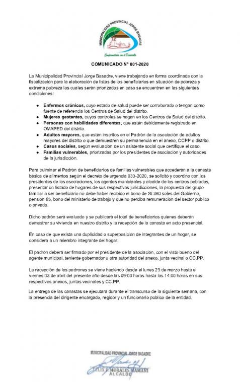 La Municipalidad Provincial Jorge Basadre, viene trabajando en forma coordinada con la fiscalización para la elaboración de listas de los beneficiarios en situación de pobreza y extrema pobreza los cuales serán priorizados en caso se encuentren en las siguientes condiciones: â Enfermos crónicos, cuyo estado de salud puede ser corroborado o tengan como fuente de referencia los Centros de Salud del distrito. â Mujeres gestantes, cuyos controles se hagan en los centros des Salud del distrito. â Personas con habilidades diferentes, que estén debidamente registrado en OMAPED del distrito. â Adultos mayores, que estén inscritos en el Padrón de la asociación de adultos mayores del distrito o que demuestren su permanencia en el anexo, CCPP o distrito. â Casos sociales, según evaluación de un asistente social que certifique el caso. â Familias vulnerables, priorizadas por los presidentes de asociación y autoridades de la jurisdicción. Para culminar el Padrón de beneficiarios de familias vulnerables que accederán a la canasta básica de alimentos según el decreto de urgencia 033-2020, se solicitó y coordino con los presidentes de las asociaciones, los agentes municipales y alcalde de los centros poblados, presentar un listado de hogares de sus respectivas jurisdicciones, la propuesta del grupo familiar a ser beneficiario no debe haber recibido el bono de S/.380 soles del Gobierno, pensión 65, bono del ministerio de trabajo y que no perciba remuneración del sector público o privado. Dicho padrón será evaluado y se publicará el total de beneficiarios quienes deberán demostrar su vivienda en nuestro distrito y la recepción de la canasta en acto presencial. En caso que exista una duplicidad o superposición de integrantes de un hogar, se considera a un miembro integrante del hogar. El padrón deberá ser firmado por el presidente de la asociación, con el visto bueno del agente municipal, teniente gobernador u otra autoridad del anexo, junta vecinal o CC.PP. La recepción de los padrones se viene haciendo desde el lunes 29 de marzo hasta el viernes 03 de abril del presente año desde las 09:00 horas hasta las 14:00 horas en sus respectivos anexos, juntas vecinales y CC.PP. La entrega de las canastas se ejecutará durante el transcurso de la siguiente semana, con la presencia del dirigente encargado, regidor y un funcionario público de la entidad. |
