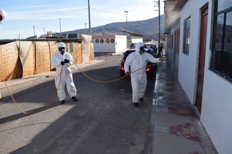Villa Locumba.- Ante el reporte del nuevo caso de Covid- 19 en el distrito de Locumba, la comuna provincial Jorge Basadre dispuso la desinfección inmediata de la parte alta del distrito capital de provincia, como son las calles de Viñas del Sur, Alto Locumba y Promuvi Señor de Locumba. Cabe señalar que estas desinfecciones se vienen desarrollando desde el 16 de marzo, con un cronograma establecido, pero se optó por adelantar el trabajo teniendo presente el nuevo caso Covid- 19 reportado en el distrito. El Ing. Cristian Lévano, responsable del área de mantenimiento de vías públicas del municipio, señaló que esta medida se llevó por encargo de la autoridad edil Félix Morales, quien dispuso además la entrega de un kit de limpieza al poblador diagnosticado como positivo, el cual fue entregado en su vivienda, donde viene llevando la cuarentena correspondiente.