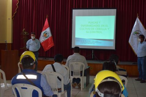 El proyecto “Mejoramiento del Servicio de Apoyo al Desarrollo Productivo de las Cadenas de Cultivo Agro Exportadores de Ají y Cebolla del Distrito Locumba” llevó adelante la capacitación al personal técnico en: “plagas y enfermedades en el cultivo de cebolla y ají, en su control”. La ponencia estuvo a cargo del Ing. Julio Chino Coloma, quien detalló de manera didáctica las diversas amenazas que afectan estos cultivos, así como el tratamiento adecuado en plagas y enfermedades.