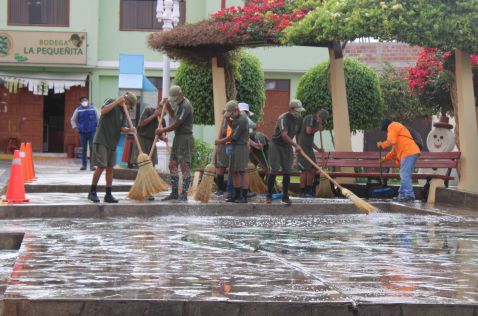 Los integrantes del agrupamiento Antitanques Blindados N°3 en compañía del equipo de limpieza pública de la Gerencia de Desarrollo Social, realizaron el baldeo y limpieza de la plaza Francisco Bolognesi del distrito Locumba.